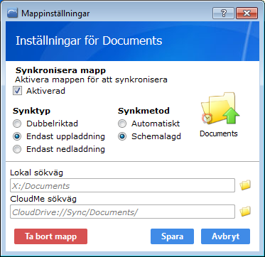När du lägger till en synkmapp till CloudMe så kommer den från början vara inställd på dubbelriktad synkning. Detta betyder att alla ändringar du gör på din dator eller i molnet kommer att speglas. Till exempel, om du tar bort innehåll i molnet, på mobilen eller en annan dator så kommer det också att försvinna på din dator. Detta gör alla molnlagringstjänster som enbart erbjuder dubbelriktad synkning som det enda sättet att synka på till en riktigt dålig lösning för att säkerhetskopiera. Med CloudMe kan du ställa in vilken typ av synkning du vill göra genom inställningar på varje mapp. Du hittar inställningarna genom att klicka på kugghjulet eller högerklicka på mappen och välja Inställningar. Ändra synktypen till endast uppladdning på alla mappar som du vill använda för säkerhetskopiering. Om du inte behöver ta en säkerhetskopia så snart en fil ändrats, ändra då synkmetoden till schemalagd. Dina säkerhetskopior görs då dagligen eller veckovis beroende på hur du ställt in schemaläggningen i programmets huvudinställningar.